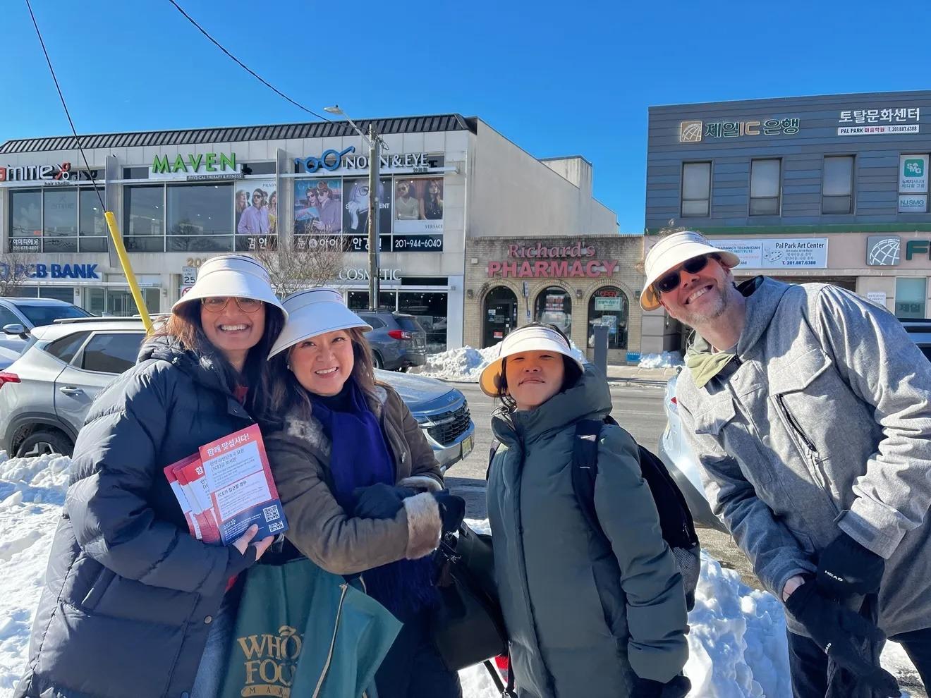 Hyun Ju Kwak y miembros de AAPI-NJ distribuyen volantes de "Conozca sus derechos" a negocios propiedad de inmigrantes en Palisades Park, después de los arrestos de ICE. AAPPI-NJ